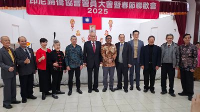 左起張忠春前理事長、何榮輝副理事長、金翠萍秘書長、李惠英前理事長、印尼駐華官員、高崇雲總院長、印尼駐華副代表卓馬廷、陳良光理事長、夏大明副主委、林狄理事長、吳鴻發理事長、印尼歸僑協會副理事長