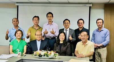 前排右起韓和元美國僑領、僑聯總會童惠珍理事長、高崇雲總院長、王海倫執行長、後排右起黃建榮僑領、龔維君秘書長、黎順發理事長、關聰名演員、施輝煌理事長、何榮輝副理事長