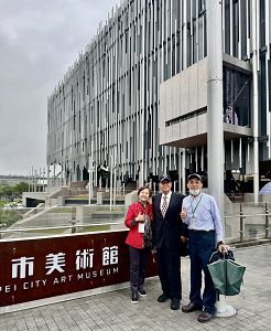 左起王海倫執行長、高崇雲總院長、楊乃翰理事長合影於新北市美術館大門