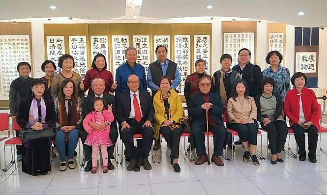 高董事長與呂仁清名書法家及松運中心藝文班夥伴合影,後排右中為詹德源班長(翰友書法會會長)、其左為書法展主持人鄭師兄、右二為本會李威侃董事、前排右起為副班長和松運中心瓊玉教練