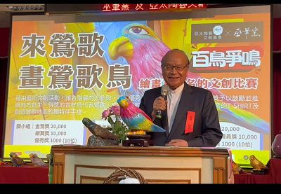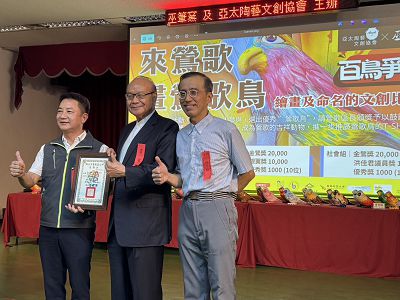 中華文化藝術總院院長、中華學術文教基金會董事長高崇雲講座教授偕同基金會王海倫執行長、高鵬翔董事應亞太陶藝文創協會楊乃翰理事長邀請,出席7月10日下午二時第一屆百鳥爭鳴來鶯歌畫鶯歌頒獎典禮,當天貴賓雲集,包括鶯歌區公所曾明華區長、洪佳君議員代表、蘇巧慧立委代表、新北市美術館蘇柏琪副館長、行銷發展部王凱薇主任、新北市陶瓷釉藥研究協會李松萬理事長、救國團江智文會長、龍華科技大學倪建芝系主任、碧龍宮何少芸顧問、鶯歌工商顏龍源校長以及參賽人、得獎人將近200位貴賓參與,共襄盛舉,在共同主辦單位曾區長致歡迎詞之後由高崇雲總院長首先致詞表示:「百鳥爭鳴活動不僅是闡明鶯歌為陶瓷之都的事實,而且同時開創了新北市文化觀光的新領域,曾局長、洪佳君議員、蘇巧慧立委等官員及民意代表對於地方文化藝術宣揚方面的貢獻頗值肯定,而楊乃翰當選亞太陶藝文創協會理事長以來,勵精圖治,推動陶瓷藝術的發展以及對鶯歌在地陶瓷的宣揚不遺餘力,值得讚嘆!