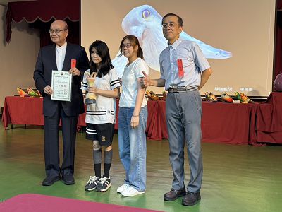 高總院長頒獎予冠軍金鶯獎得主、其右為家長、最右為楊乃翰理事長