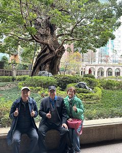 在鄭書鎮董事長所居大吾疆園區合影,左起鄭董事長、高總院長、王執行長