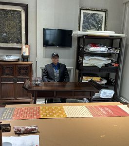 高總院長坐在鄭書烈董事長工作室書桌前、前面陳列了一項清朝嘉慶皇帝的聖旨歷史文物