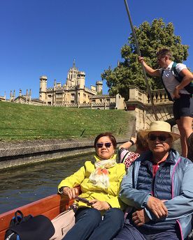 高董事長與撐篙劍橋學生在康河小船上,背景是劍橋大學國王學院建築大樓