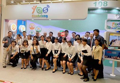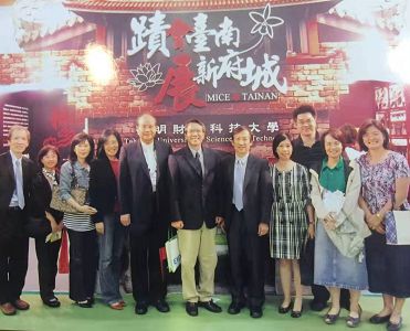 右二是英宗宏教授為本次參加會展競賽主辦人,曾經擔任過公司總經理,實務經驗極為豐富,右三為高崇雲董事長,右四為黃文洲主任,中為徐守德校長,校長後方為尢燈煌主任,最高的是推廣教育中心主任高鵬翔,其左為王高樑教授、鮑慧文教授、賴淑惠教授!其他是校友。