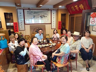 林口藝術文化發展協會常務監事陳昆諒於龍壽茶館泡茶迎客,其右為素貞、爾繪、王淑娟理事長、一排右起倪永霞老師、高董事長伉儷、曾悅子理事長、芝蘭、貴玲、芳姿