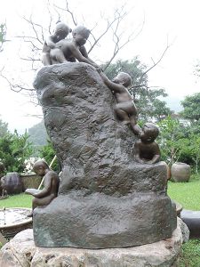 國父紀念館中山庭園王秀杞大師作品:〈講古〉刻畫出親子互動的溫馨場景,柔和的線條,表現出親情的珍貴