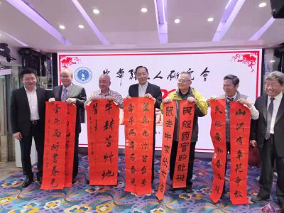 五位主要貴賓,左二是高崇雲董事長、左三是吳其樑理事長、左四為王詣典中將、右二是金國樑副理事長、右三是劉艾迪副理事長,左邊是孫天平理事長、右邊是王正典秘書長,他們手上持有的都是名書法家的作品