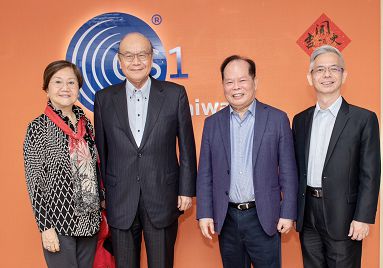 左起王海倫執行長、高崇雲總院長、林暉總裁、楊旭堂院長合影於全球商業網公司大門