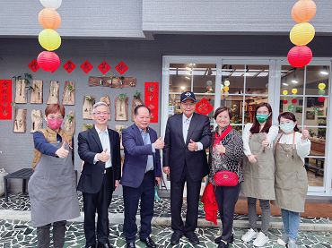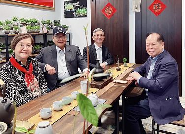 林暉總裁在其所屬種子盆栽藝術推廣中心以茶點接待來訪貴賓,右起林暉總裁、左起王海倫執行長、高崇雲總院長、楊旭堂院長