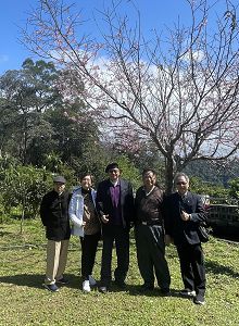 在文化館庭園櫻花樹下合影,左起林金豐理事長、王海倫執行長、高崇雲總院長、吳朝滄理事長、何正一會長