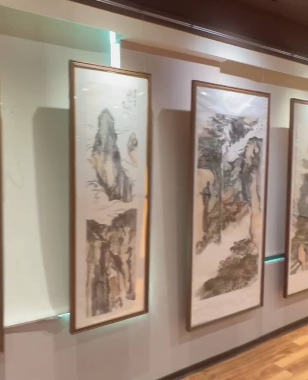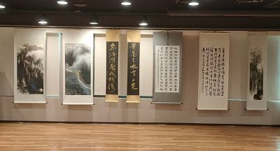 現場展出的畫作右起江明賢大師水墨畫創作、連勝彥大師墨寶、林暉總裁墨寶