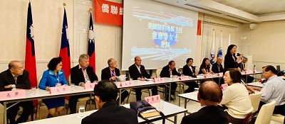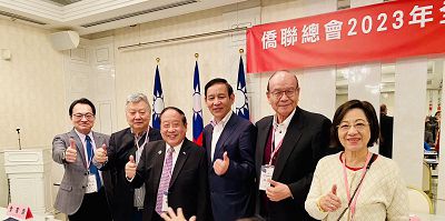 左為我駐東京副代表周學佑、鄭致毅理事長、僑聯舊金山辦事處主任張人睿、高崇雲總院長等人在晚會中歡呼
