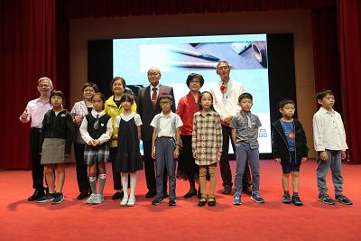 書法教育專家與得獎小朋友合影,後排左起楊旭堂院長、張麗華執行長、王海倫執行長、高崇雲總院長、林亮吟理事長、黃緯中教授