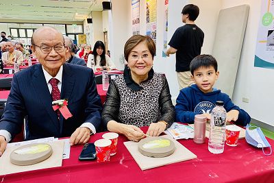 貴賓學陶、左起高總院長、王執行長、高聖竣小朋友