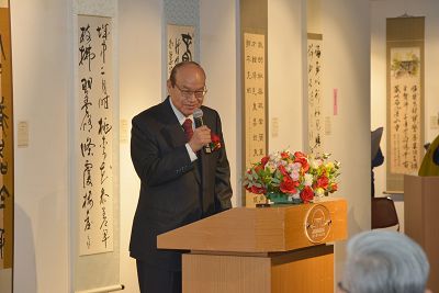 高院長致詞表示,這一項隆重的國際盛會已經舉辦了數十年之久,迄今還能夠繼續,實在難能可貴。尤其是今天由林理事長主辦的活動非常精彩,請到了文化大學許多國樂的專家,音樂和書法的結合作為開場值得讚揚,因此林理事長及所有工作團隊努力貢獻值得肯定。他說:傳統書法是我國的瑰寶,近幾年來在連院士、楊院長及林理事長等書法界大師暨精英們共同努力推動之下,台灣已成為全球華人發揚傳統書法藝術的核心重鎮,期盼台灣所有的書法大家們能夠聯合一致,將書法教育發揚光大,然後與大陸及全球華人書法家共同開創傳統書法的新境界!他最後強調說:書法是中華美學的象徵與代表,台灣、日本、韓國都有幾百萬人士學習書法,而大陸書法學習者更超過數千萬人此一東方文化的美學象徵應該傳播於全球而揚名全世界。