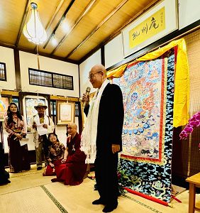 中華學術文教基金會董事長、中華文化藝術總院院長高崇雲講座教授偕同基金會王海倫執行長於4月13日下午2時前往同安街百年古蹟紀州庵出席由西藏人文協會李茂榮理事長及唐卡畫家貢噶堪卓兩位所主辦的「樂巴.神化唐卡」藝術展。當天參與藝文人士頗多,包括中華真快樂公益服務協會林宏展理事長、台灣印社鄭多鏗教授、茱莉亞舞蹈團張卉玉團長、林俊呈執行長等百餘位藝術家、藝文人士參與共襄盛舉。高崇雲總院長在遠從西藏專程來台的仁珍千寶上師致詞後發表談話表示:「樂巴唐卡畫展係由唐卡畫家貢噶堪卓率領26位台灣本土唐卡畫師聯合展出,時值動盪不安的現階段,此一項別開生面的藝術活動必將可療癒人心、淨化社會。」