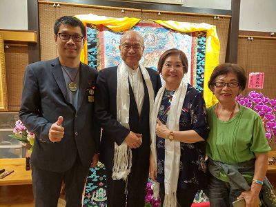 其左為西藏上師、貢噶堪卓畫家、李茂榮理事長、最佳司儀