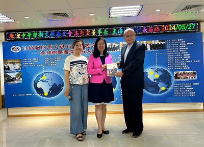 高崇雲總院長贈送最新著作〈龍行天下台灣領航〉乙書予華僑救國聯合總會新任童惠珍理事長表示祝賀之忱